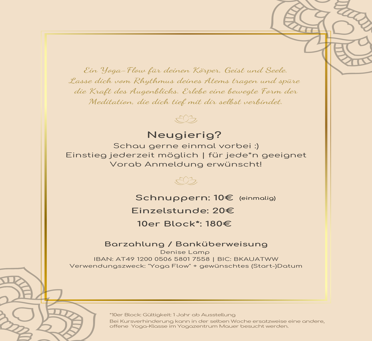 Zahlungsgrund: "Yoga Flow" + gewünschtes (Start-)Datum